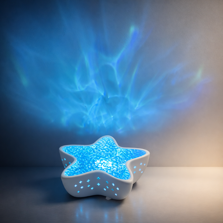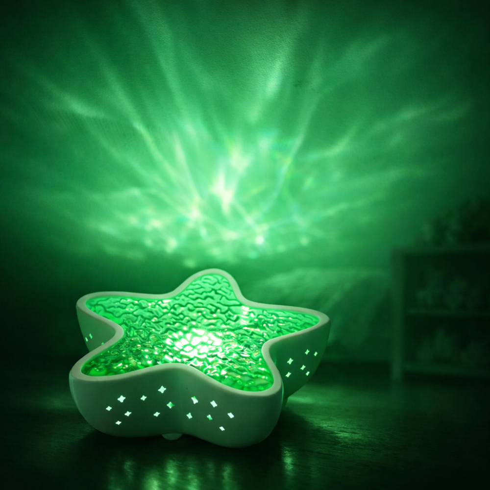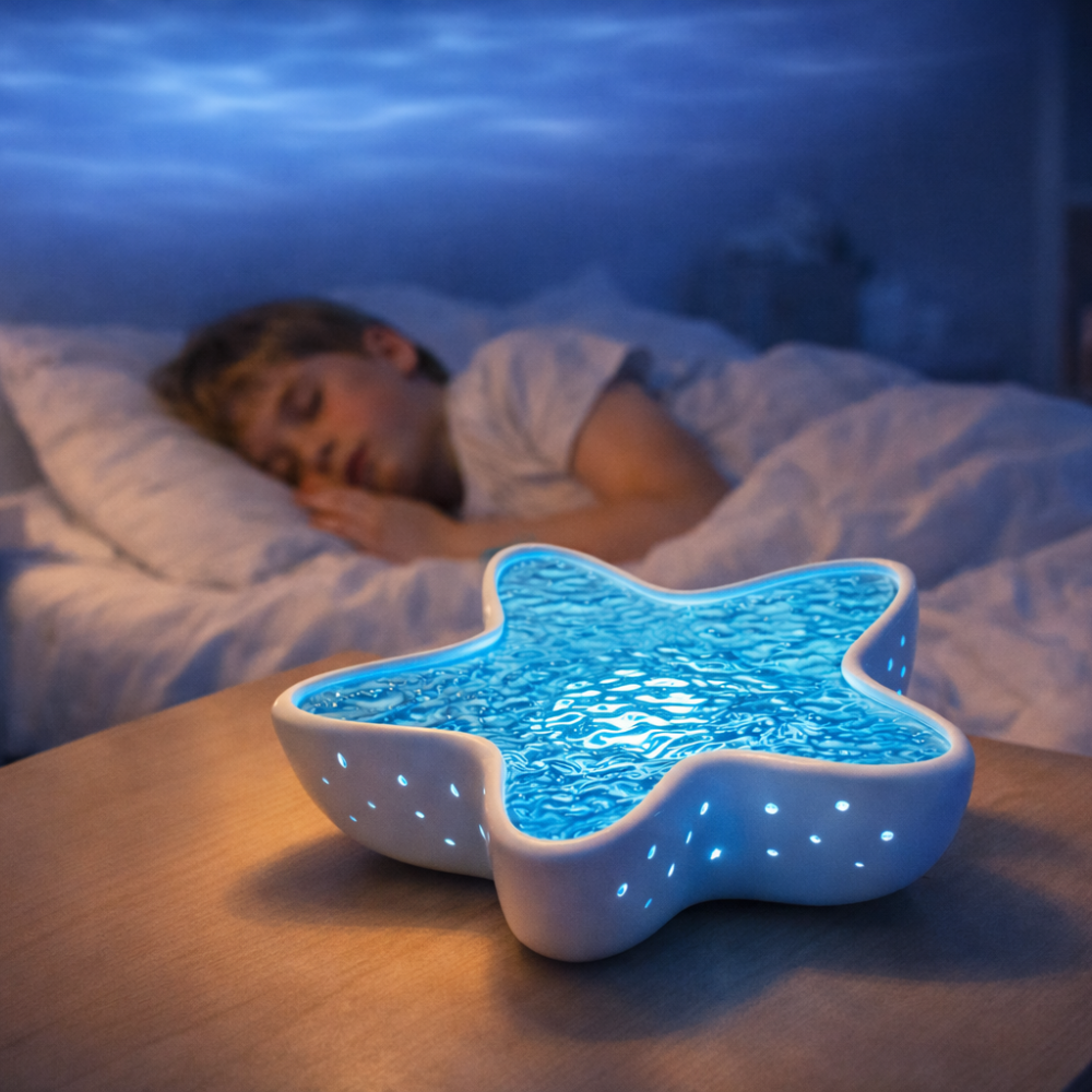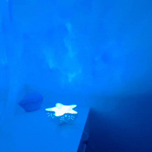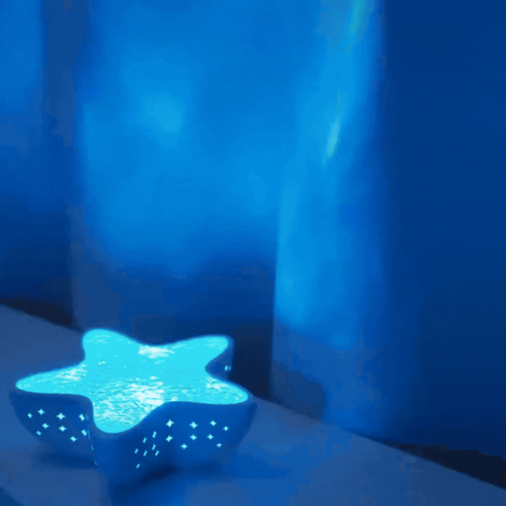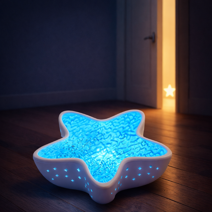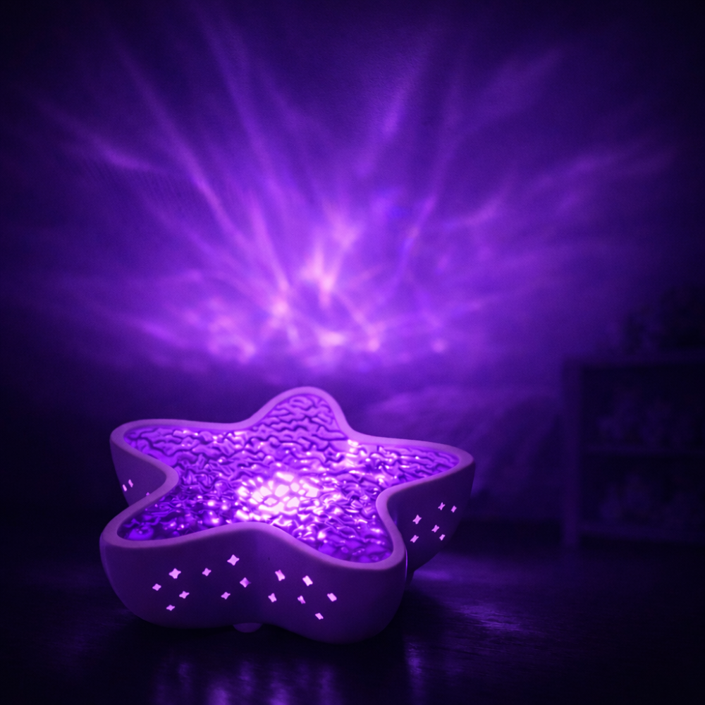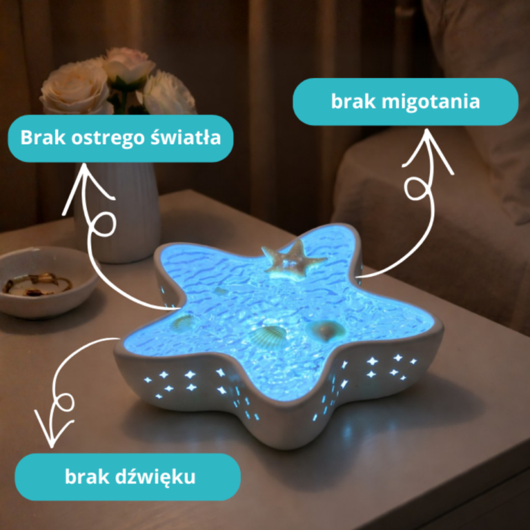 Łagodne, rozproszone światło tworzy spokojne tło do zasypiania. Powolny ruch światła daje oczom punkt skupienia i pomaga naturalnie się wyciszyć.